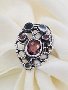 This stunning one-of-a-kind-ring is handcrafted in 925 Sterling Silver and featured as a center piece a mesmerizing faceted Zultanite gemstone, known for its unique color changing beauty. Accented with a delicate Aquamarine, Red Garnet and Green Peridot, this design creates a perfect balance of elegance and bohemian charm.