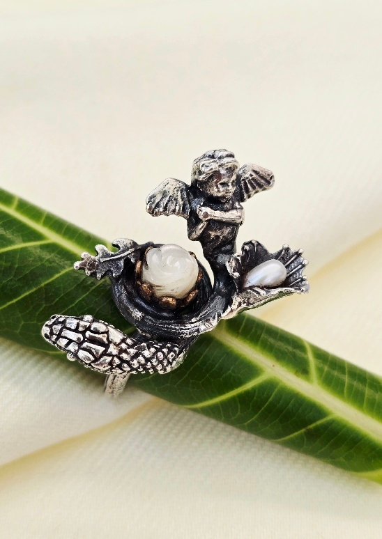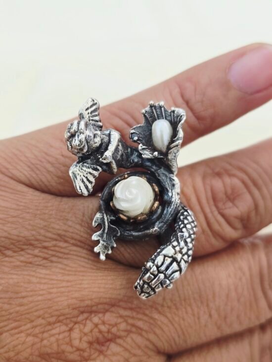 This Sterling Silver Angel and Snake Ring with a Mother Of Pearl Rose Statement Ring is one-of-a-kind-ring to save is your collection. A powerful symbolism of balance between light and shadow. Is OOAK handcrafted ring is a solid sterling silver featured a carved Mother of Pearl rose at its center, embraced by delicate pearls and leaves. An angel rest on one side, while a serpent guards the other – representing protection, transformation, and give duality.